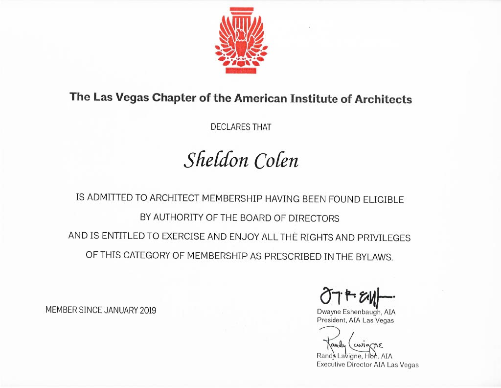 As a Las Vegas resident, Sheldon Colen is a member of the local chapter. The chapter has a mission statement that is easy to connect with.  Advocating for and Advancing the Profession of Architecture and Design in Southern Nevada. (2)