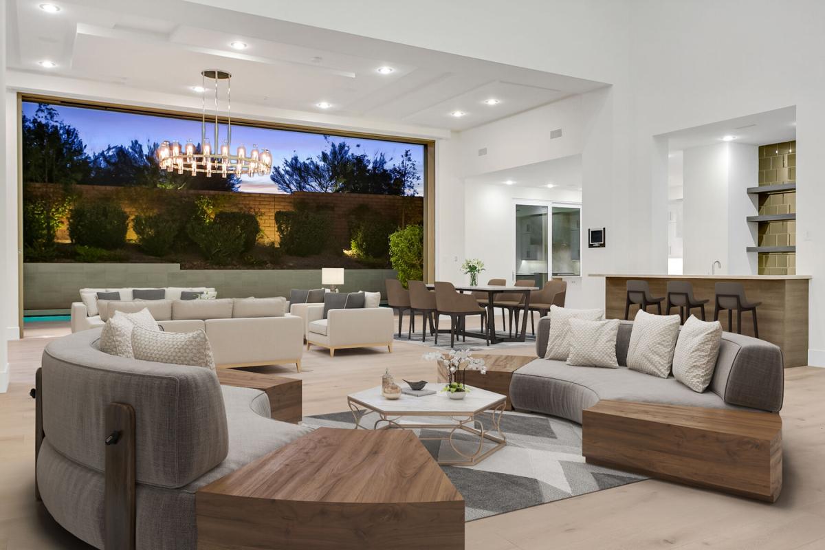 This Custom 2 story home in Summerlin has over 7,800 square feet of livable space. With 5 bedrooms and 7 bathrooms this modern luxury home was designed with style and sophistication. Bringing the outdoors inside, this well designed home opens to a luxurious pool and natural landscape.