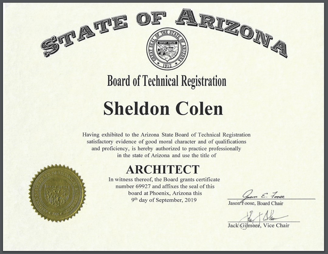 SCA Design is licensed in Arizona. Nevada. And Utah. Principal architect, Sheldon Colen, recently submitted for the additional professional registration. The Arizona Board of Architecture granted his license. Native to Las Vegas, Nevada, Colen also spent time in his younger years attending school in the Grand Canyon State.